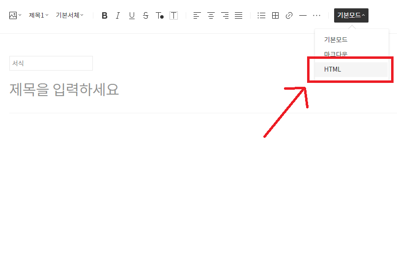 에디터 모드를 [기본모드 -> HTML] 로 변경해 줍니다