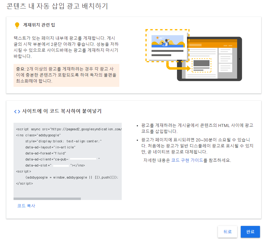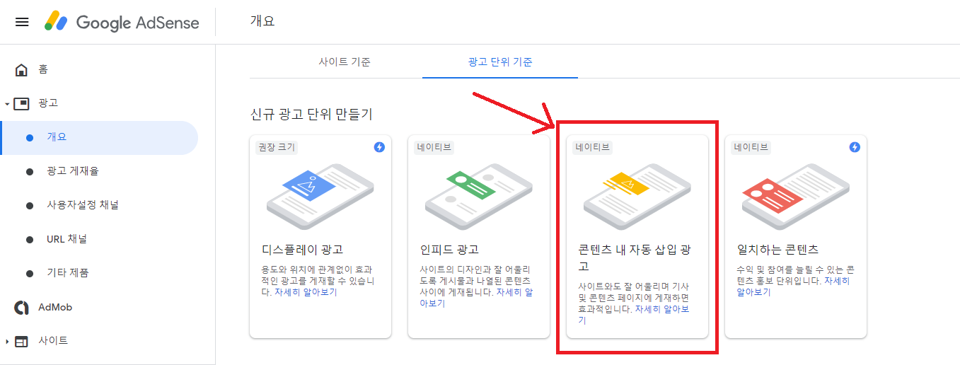 콘텐츠 내 자동 삽입광고를 클릭하여 광고를 생성해 줍니다.