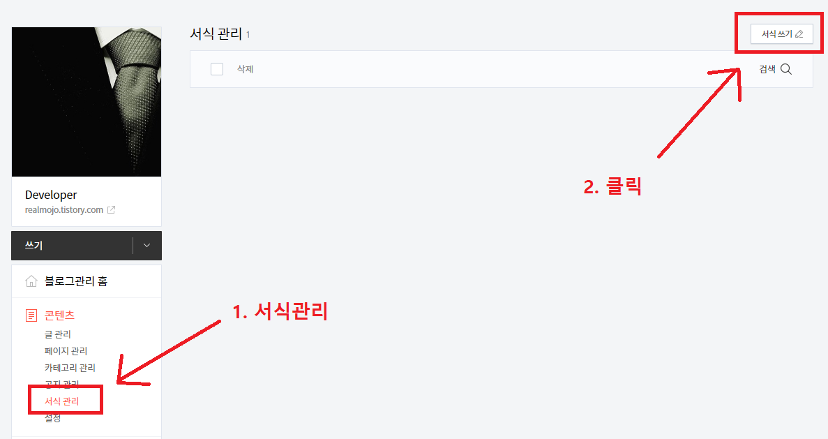관리자 페이지의 서식관리로 들어가서 서식쓰기를 클릭합니다