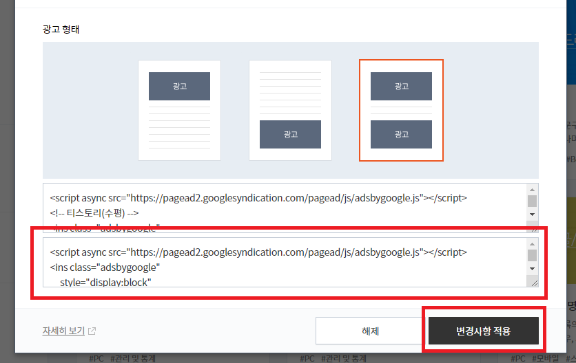 보통 하단에 많이 작성을 합니다. 아까 복사해둔 코드를 하단에다가 삽입하고 변경사항 적용을 클릭하면 적용이 완료됩니다.