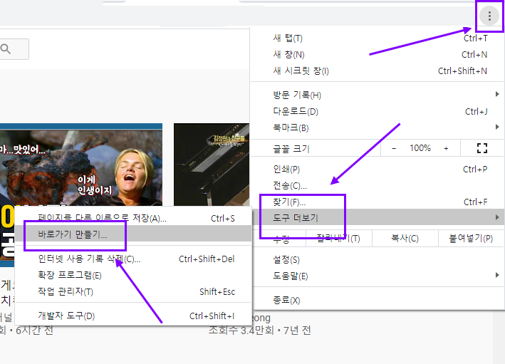 크롬 브라우저 우측상단에 메뉴버튼을 클릭 > 도구 더보기 > 바로가기 만들기를 클릭해서 들어가 줍니다.
