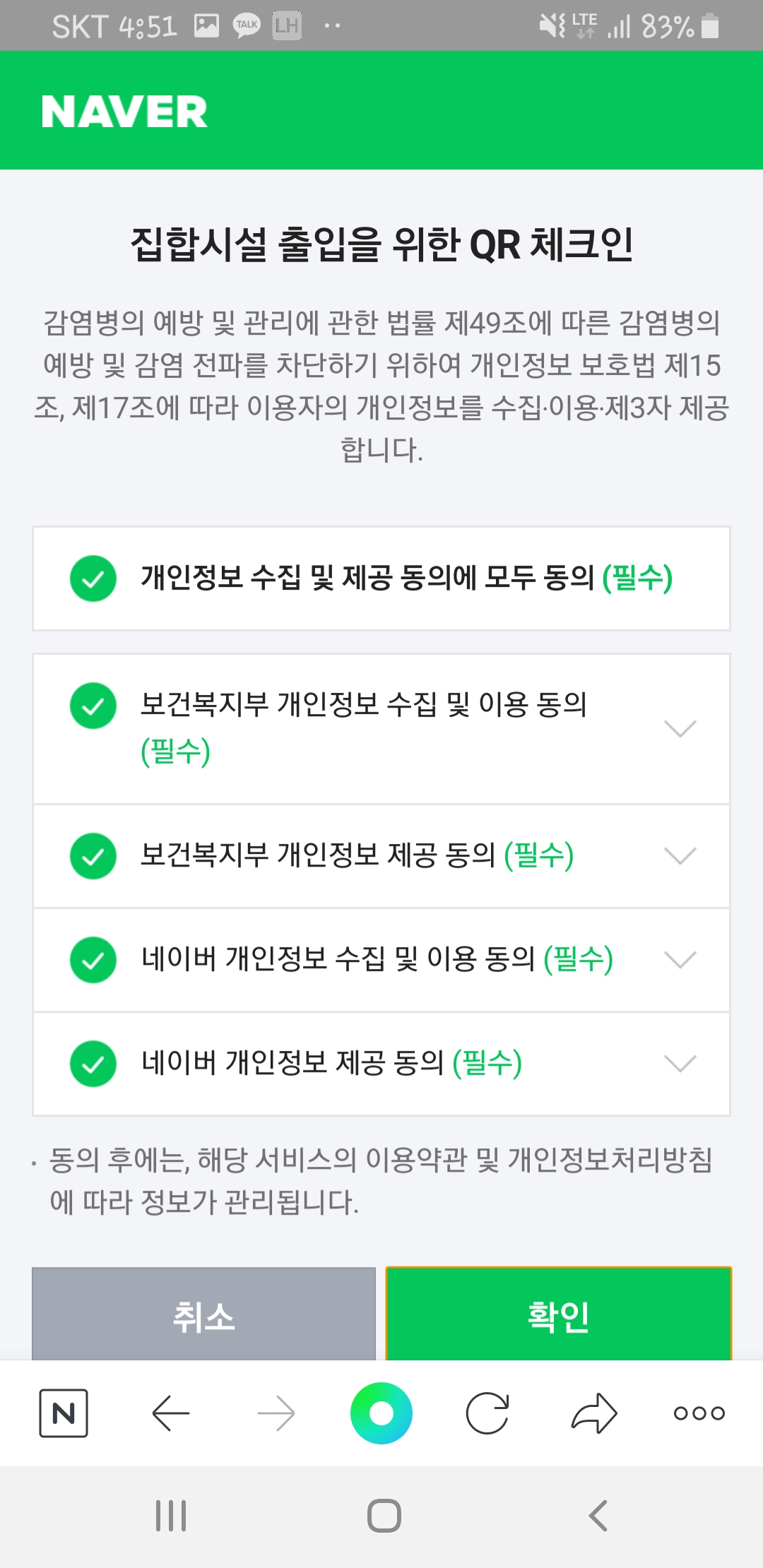 QR체크인을 클릭하면 집합시설을 위한 QR체크인이 나오는데 필수이기 때문에 모두 체크를 하시고 확인 버튼을 누른 후 넘어가신 후에 휴대전화로 본인인증을 진행 하여 줍니다.
