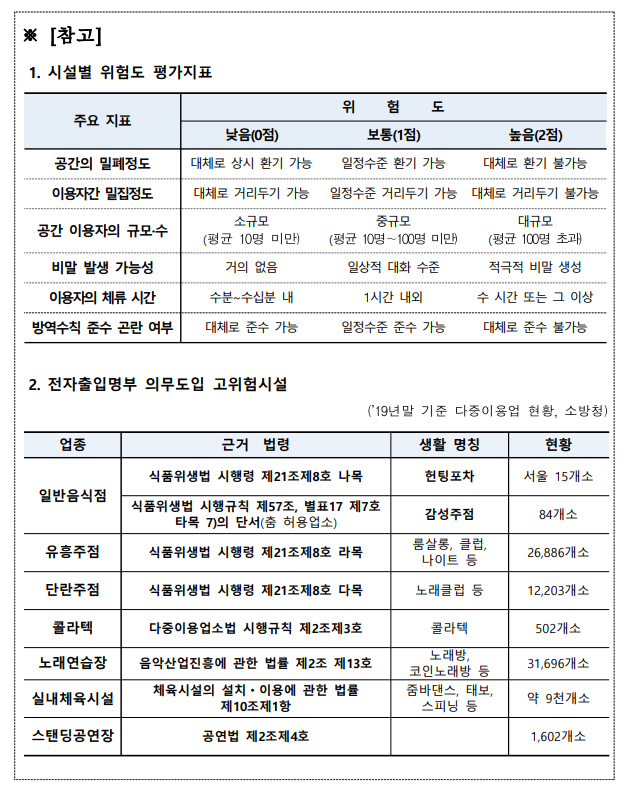 QR코드 전자출입명부가 반드시 적용이 되어야 하는 의무시설과 자발적으로 참여하는 임의시설로 분리하여 적용이 됩니다. 의무시설은 집합제한명령 시설 포함 고위험 시설을 포함합니다. 6가지 위험지표(밀폐도, 밀집도, 활동도, 군집도, 지속도, 관리도)를 준수해야 합니다. 임의시설은 지자체 판단에 따라 필요한 경우 권고한 시설과 자발적으로 적용된 시설을 분리합니다.