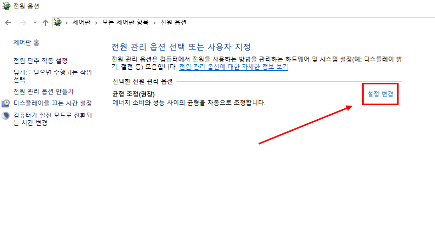 전원옵션에서 설정변경을 눌러서 들어가 줍니다.