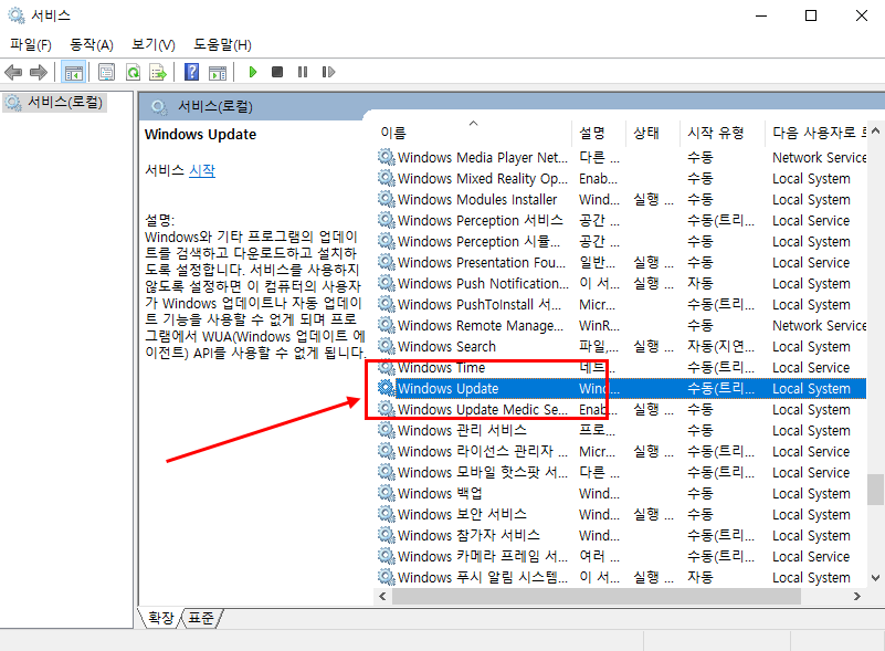 스크롤로 내려가서 하단에 보시면 Windows Update 부분까지 내려와 줍니다. 더블 클릭해서 상세정보 페이지에 들어가 줍니다.