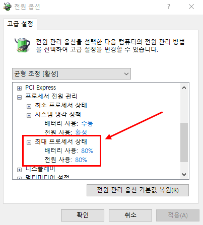 프로세서 전원관리 - 최대 프로세서 상태 - 전원사용 80% 수정한후 확인을 해줍니다. 그러면 CPU 사용량이 최대 80%이상 사용하지 않게 되서 팬소음을 조금이나마 줄일 수 있습니다.