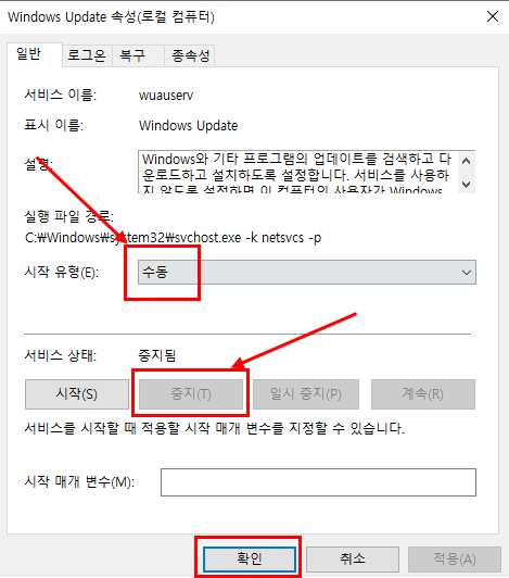 윈도우를 포맷을 하거나 새로 구입해서 사용 하였을 때는 보통 자동으로 되어 있는데 시작 유형을 수동 혹은 사용 안함으로 바꾸고 서비스 상태를 중지 시킨 후 확인을 눌러 줍니다.