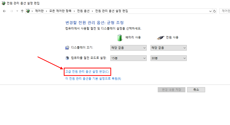 고급 전원 관리 옵션 설정 변경을 눌러서 들어가 줍니다.