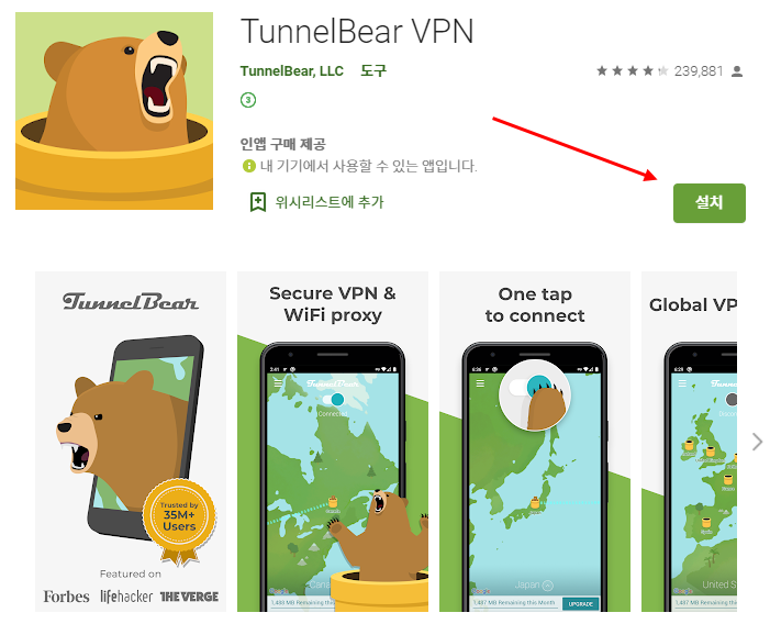 위의 플레이스토어에 접속하셔서 터널베어의 앱을 설치하시면 됩니다.