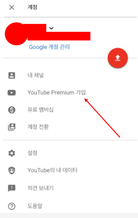 결제를 하기 전에 모든 절차가 끝났습니다. 모바일로 유튜브를 접속해 줍니다. 그리고 좌측 상단의 메뉴를 선택하여 계정을 선택하여 줍니다. Youtube Premium 가입을 선택하여 줍니다.