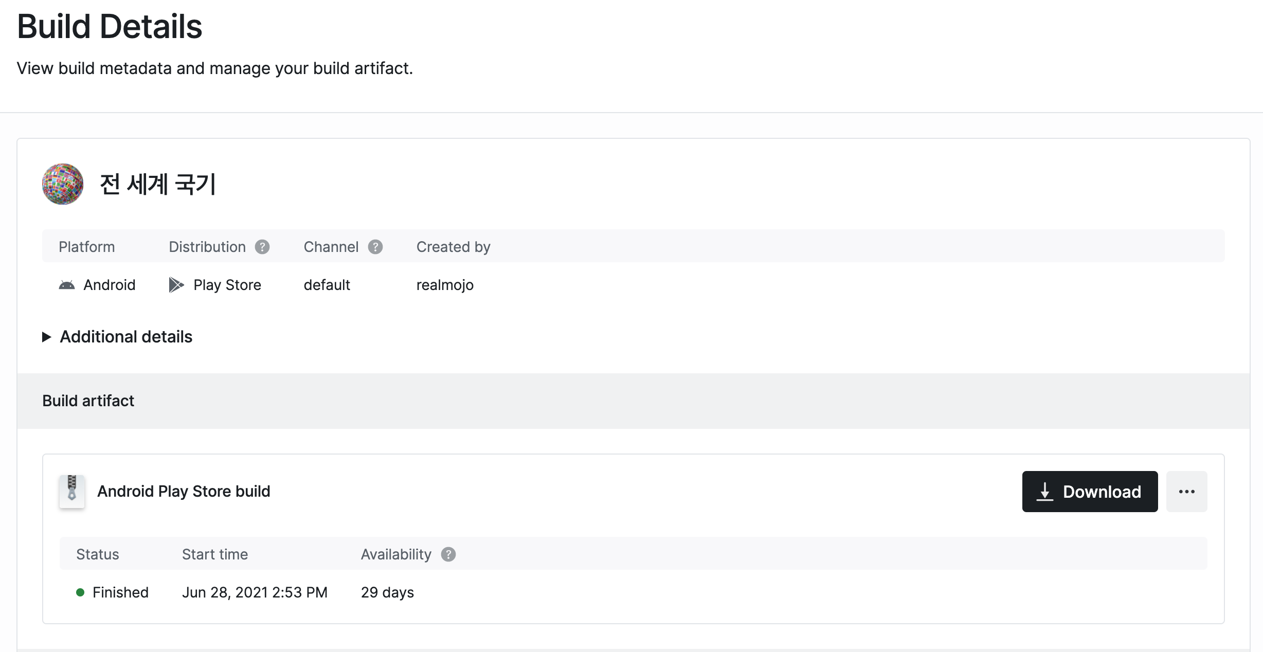 위의 명령어(expo build:android)를 통해 빌드를 마치고 나면(약 20분~30분 정도 소요) Expo 관리사이트에서 확인을 할 수 있다. 빌드가 끝나면 콘솔창에도 웹 링크가 나타나니 크게 신경쓰지 않아도 된다. 빌드가 완료되면 Download 버튼을 눌러 *.aab 파일을 받으면 되고 플레이스토어에 등록하면 된다.