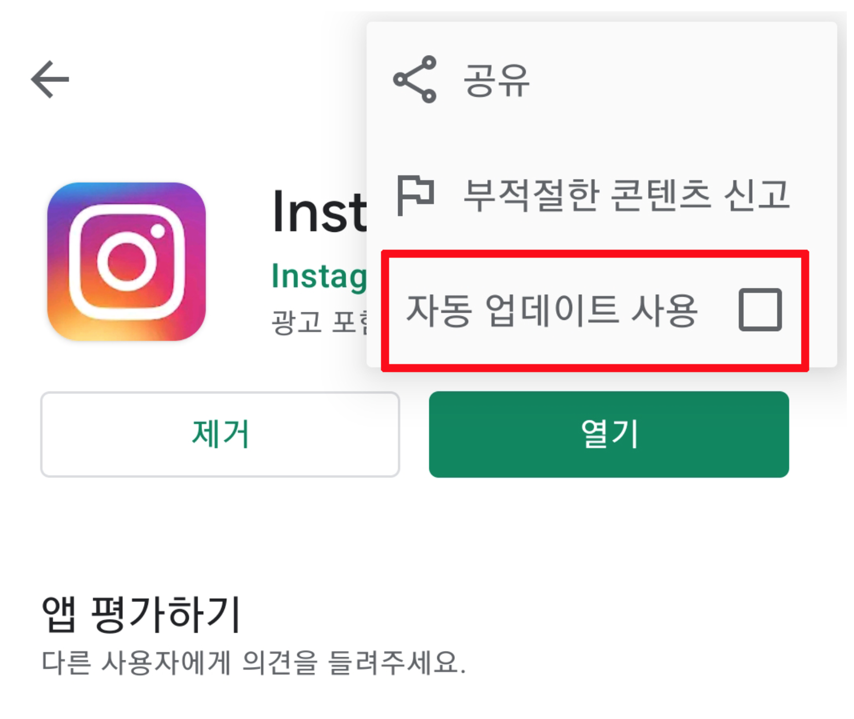 인스타그램 릴스를 제거하기 위해 앱을 다운그레이드 해야하기 때문에 자동업데이트는 미리 체크해제를 해주시는 것이 좋습니다. 다운그레이드되어 있는 앱을 설치했는데 자동으로 업그레이드 되면 지금 하는 방법을 다시 해야하기 때문입니다. 아래에서 캡쳐해둔 사진으로 확인을 해보시길 바랍니다. 아니면 와이파이일 때만 업그레이드 하도록 설정해 두어도 평소에는 자동업데이트가 되지 않은 것을 확인 할 수 있습니다.