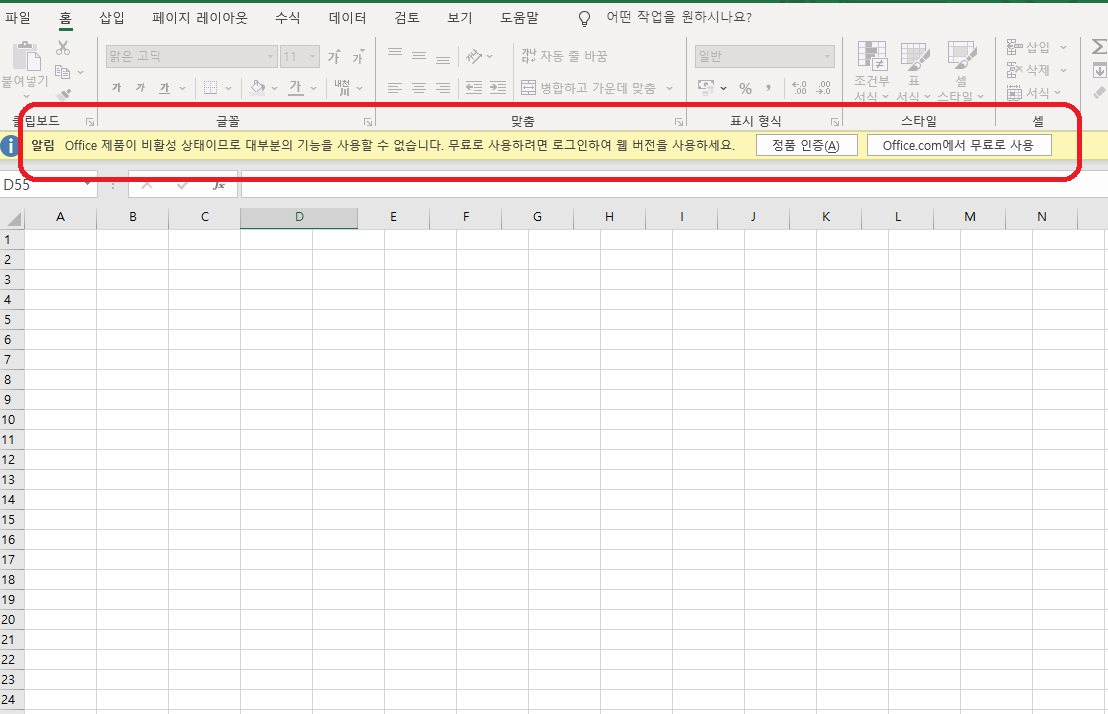 오피스 2019를 실행시켜 보면 아직 정품이 인증이 되지 않아 상단에 노란색 줄로 정품인증을 먼저 해달라는 경고메세지가 나옵니다. 우선은 이것도 가볍게 무시해주시길 바랍니다.