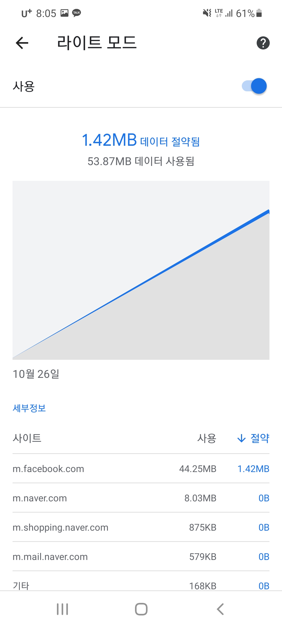 설정 - 라이트모드 - 활성화를 해주시면 인터넷을 하던 도중 필요 없는 파일들을 사용하지 않게 함으로써 데이터를 절약할 수 있게 됩니다. 처음에는 중간 이미지처럼 아무것도 없다가 인터넷을 조금 사용하다 보면 우측의 이미지처럼 데이터가 절약되는 것을 확인할 수 있습니다.