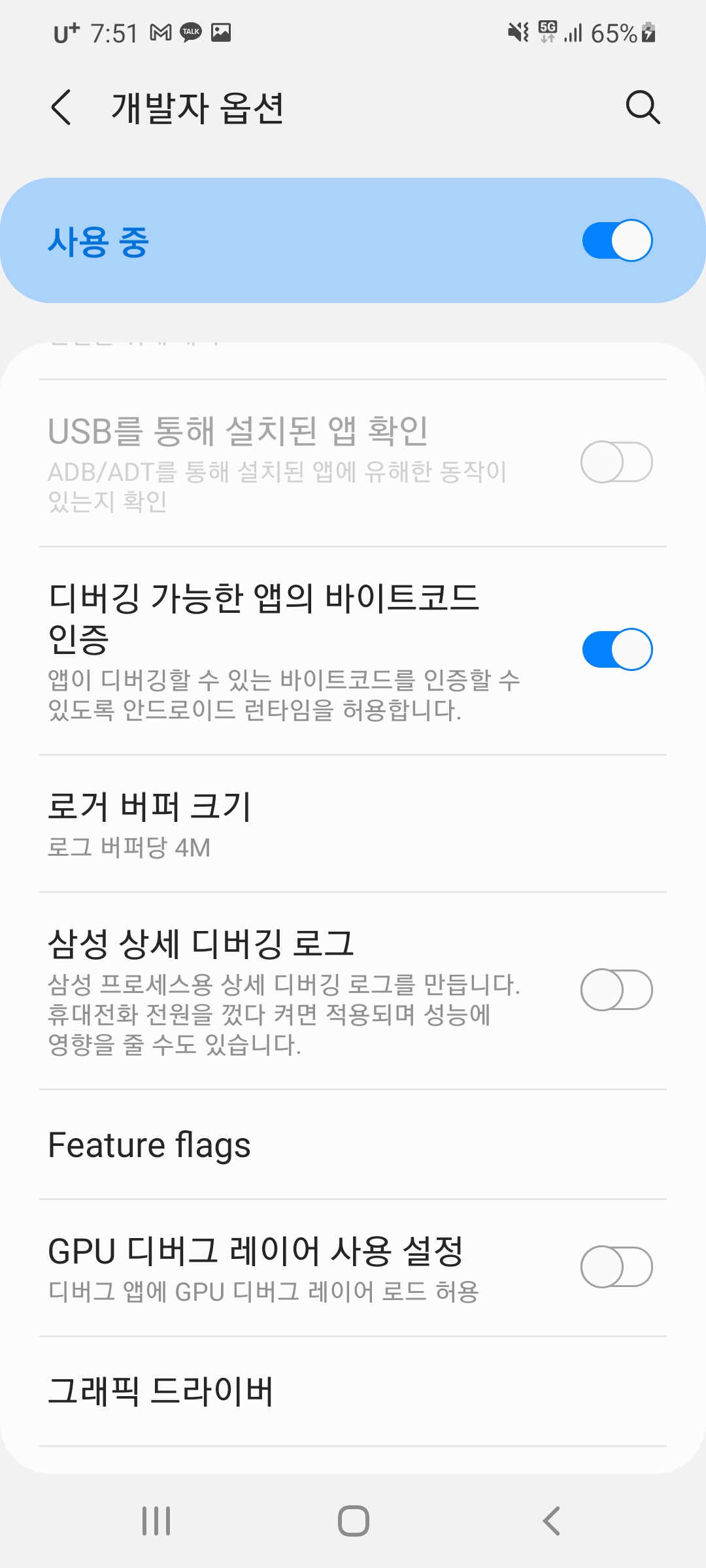개발자 옵션 탭으로 들어가서 중간쯤에 확인해 보시면 로거버퍼크기 탭을 클릭해서 16M로 변경해주시면 됩니다.