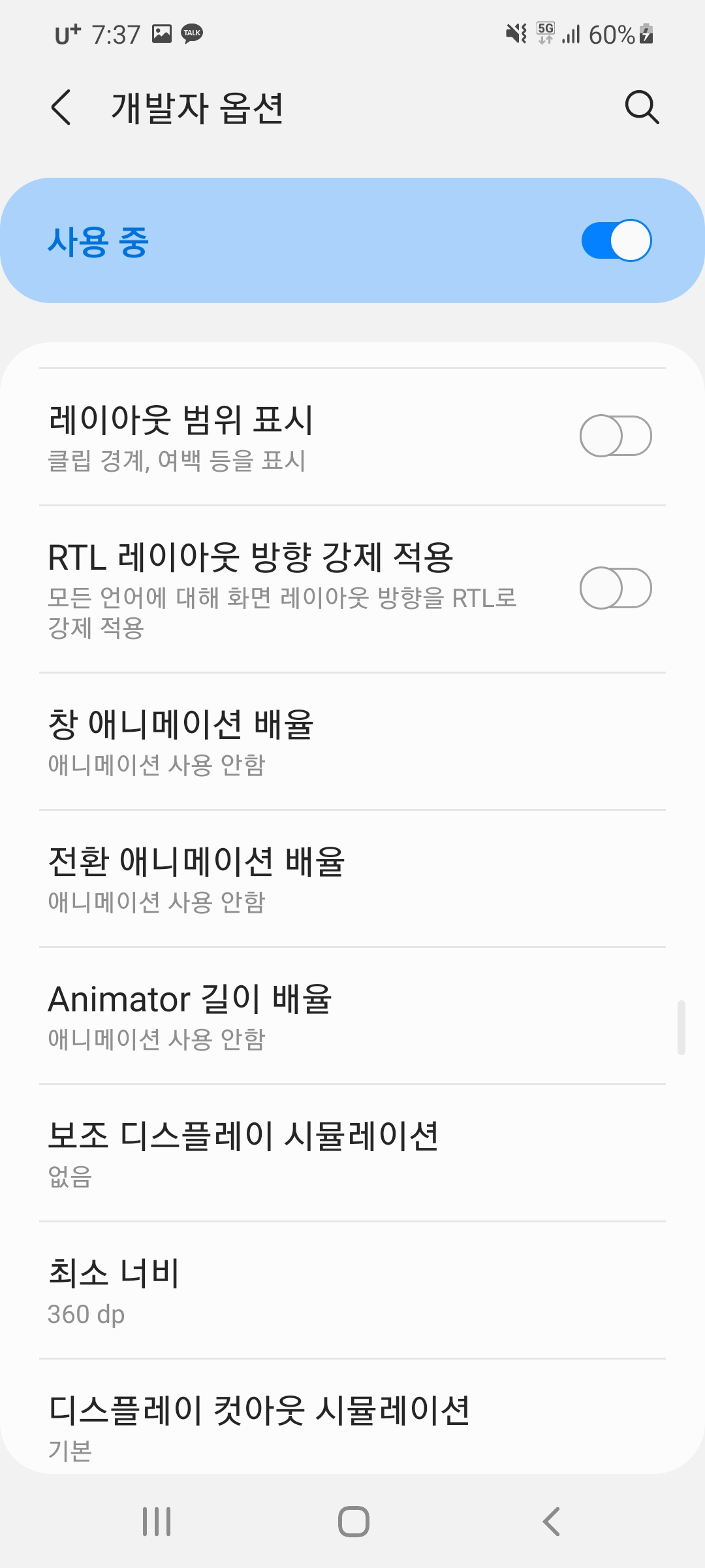 빌드번호를 7번 누르게 되면 개발자 모드가 실행이 됩니다. 그러면 다시 설정으로 와서 맨 하단에 개발자 옵션 탭이 생성된 것을 확인할 수 있습니다. 개발자 옵션 탭에 들어가셔서 중간쯤에 창 애니메이션 배율, 전환 애니메이션 배율, Animator 길이 배율을 모두 사용 안 함으로 적용해주시면 됩니다.