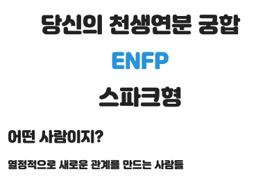 - ENFP는 스파크형 유형의 사람으로서 열정적이고 불꽃 피우는 관계를 좋아하는 사람들 입니다. 매사에 정열적이고 상상력이 좋아 사랑 또한 열정적으로 합니다. 충동적일 수 있으며 즉흥적이기 때문에 당황할 수도 있습니다. 이별을 하면 혼자서 극복을 하려 할 것입니다. 또한 지인들에게 이별을 알려 빨리 잊어버리고 새롭게 사람을 다시 만납니다.