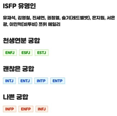 - 따듯한 감성을 가진 ISFP는 성인군자형이 많습니다. 유명 연예인으로 유재석이 있으며 이들은 다정하고 온화한 성격을 지닌 사람들이 많습니다. 마음을 열기에는 시간이 필요하지만 한 번 사랑에 빠지면 충성적인 로맨스를 볼 수 있습니다. 이들은 이별 후에도 스스로의 관계를 끊어내지 못하기 때문에 현실 도피하거나 부정하려는 성향이 있습니다. 각자의 미래를 위해 빨리 잊는 편이 좋습니다.