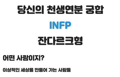 - 이상적인 세상을 원하는 사람들이며 INFP의 사람들은 감정이 풍부합니다. 배려심이 많고 주로 로맨티시스트가 많이 분포되어 있습니다. 창의적이고 예술적인 감각이 풍부하기 때문에 연애를 시작할 때도 장난으로 심한 말을 하지 않도록 합니다. 이별을 하였을 때에는 이별에 대한 결과를 본인에게 돌아보는 경향이 있습니다. 혼자 있기보다는 새로운 곳도 가보는 것이 좋습니다.