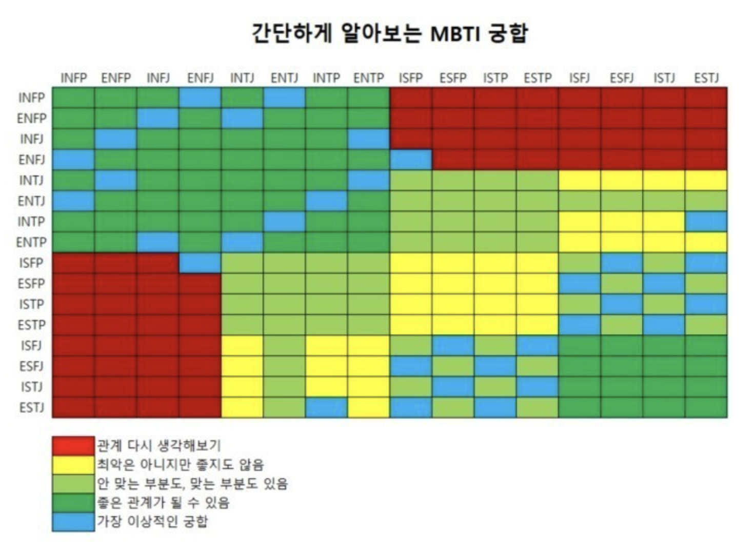 MBTI 연애 이별 유형으로는 정말 다양하게 존재합니다. MBTI 궁합에 대한 간단한 궁합 표입니다. 각 INFJ의 연애 이별 유형은 어떤지 알아보도록 하겠습니다. 글 하단의 사이트를 확인하면 더 자세하게 알아보실 수 있습니다.