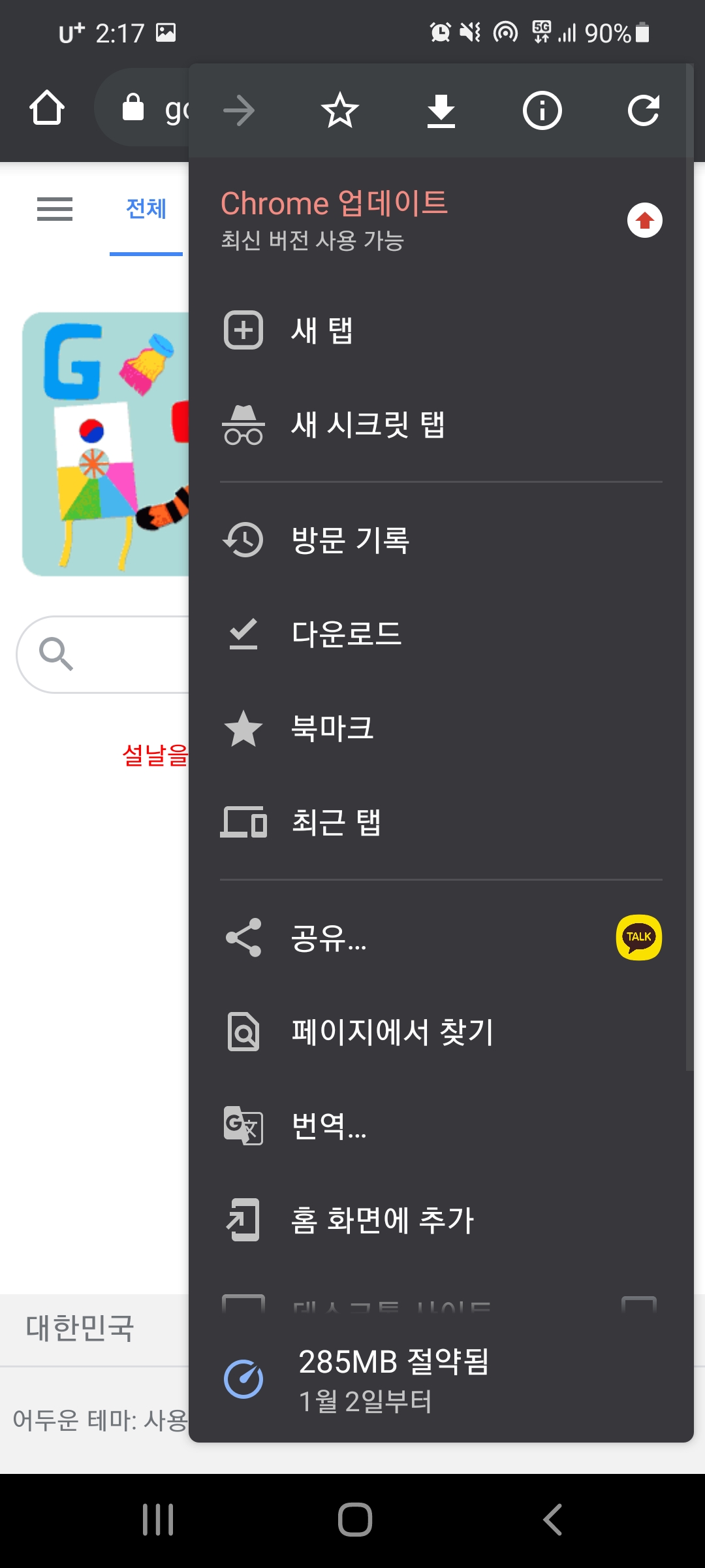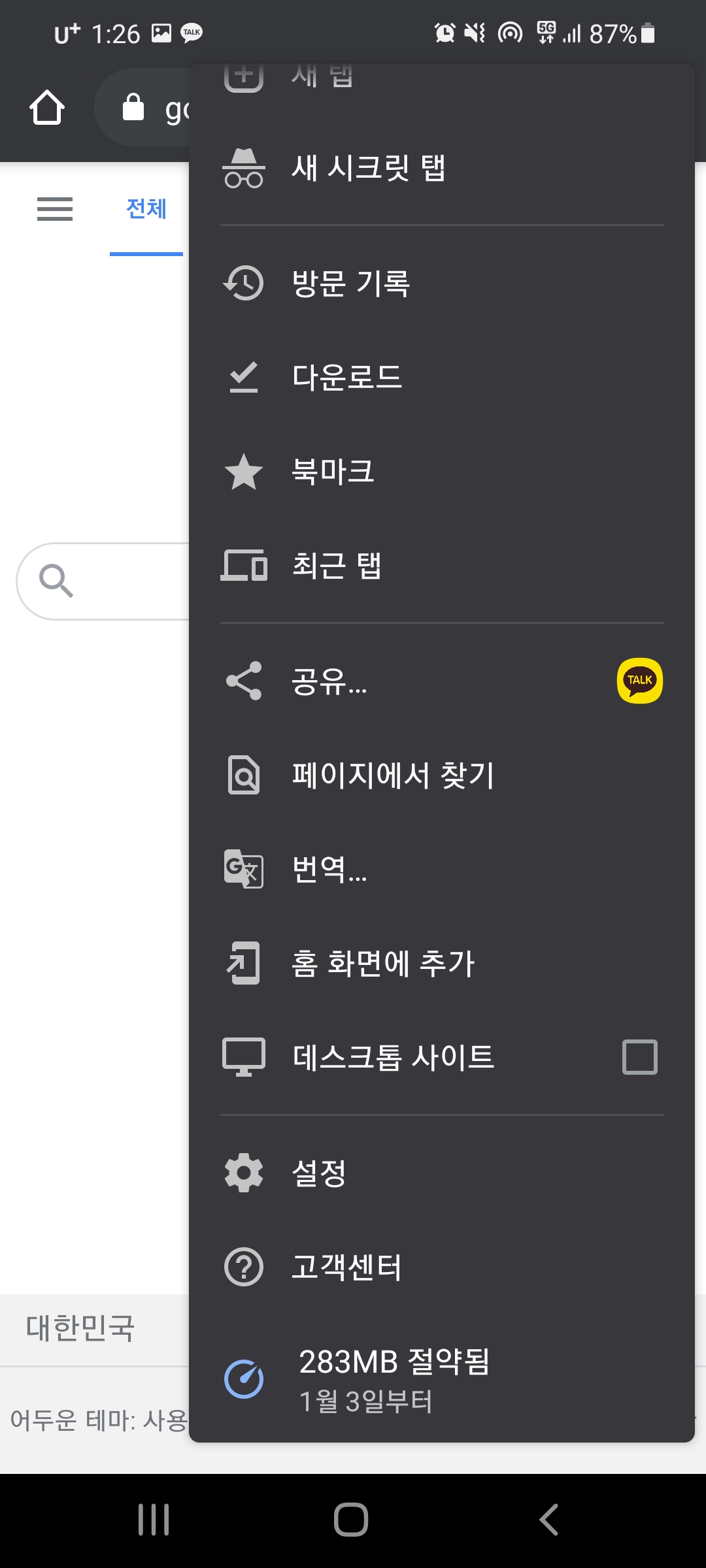 우선 크롬을 열어 줍니다. 크롬을 열어 우측 상단에 더보기 버튼을 클릭한 후 데스크톱 사이트를 체크 하여줍니다. 그러면 PC용 화면으로 바뀌는것을 확인할 수 있습니다.