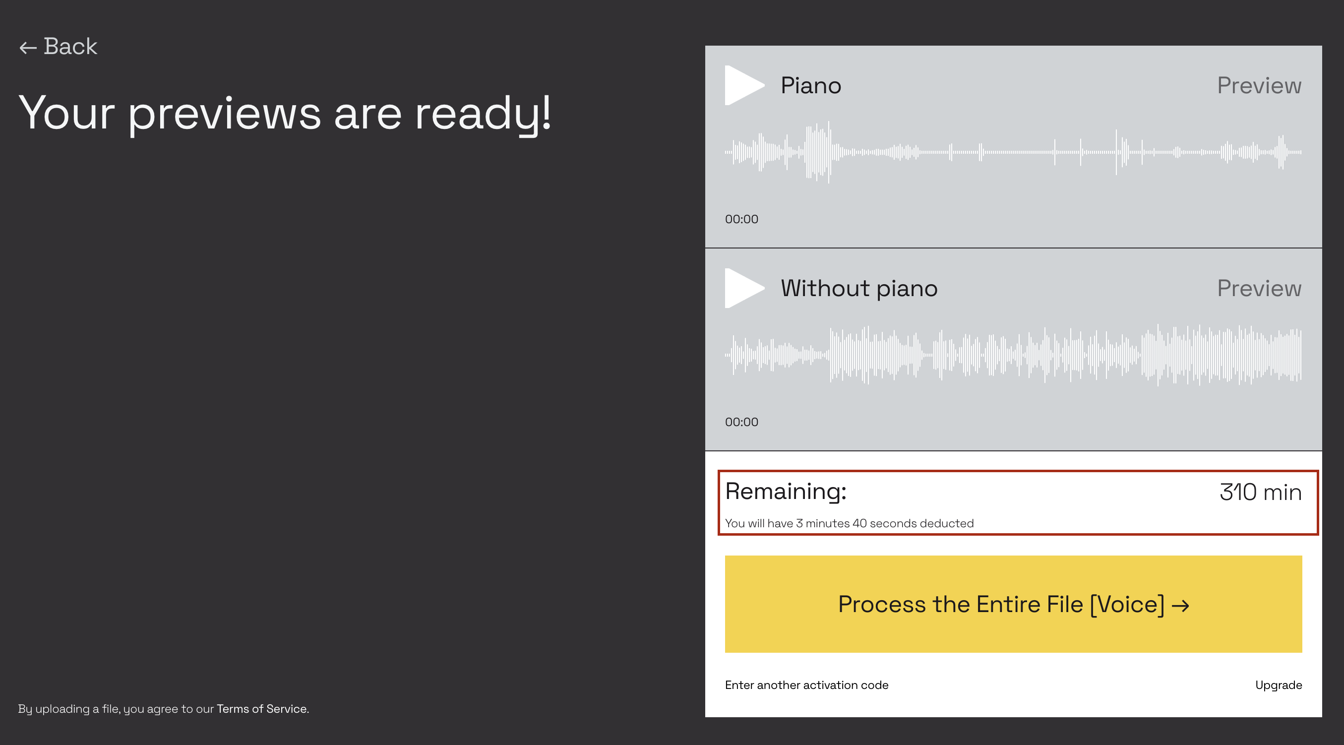 실제 결제를 하게 되면 아래의 이미지처럼 몇 분의 시간이 남아 있는지 확인이 가능합니다. 저는 30달러짜리를 구매하였기 때문에 310분간 어떤 음원이든 분리가 가능하게 되었습니다.